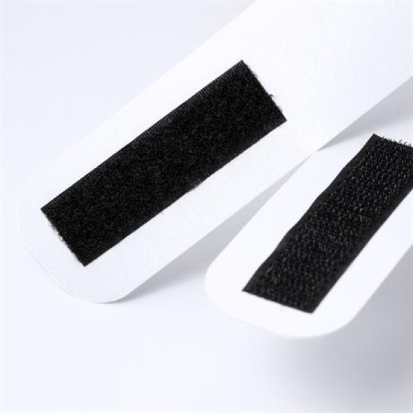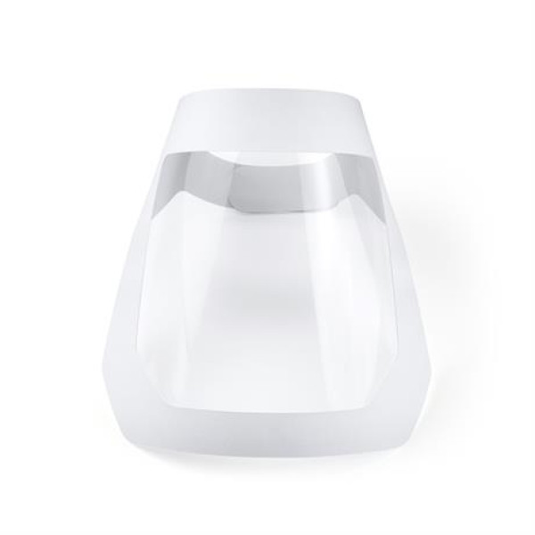 Flexible and lightweight reusable face shield, made of white laminated cardboard and PET. Easy to customize. Adjustable fastening with black velcro. Foam rubber padding for a comfortable fit to the forehead. Splash-proof design.