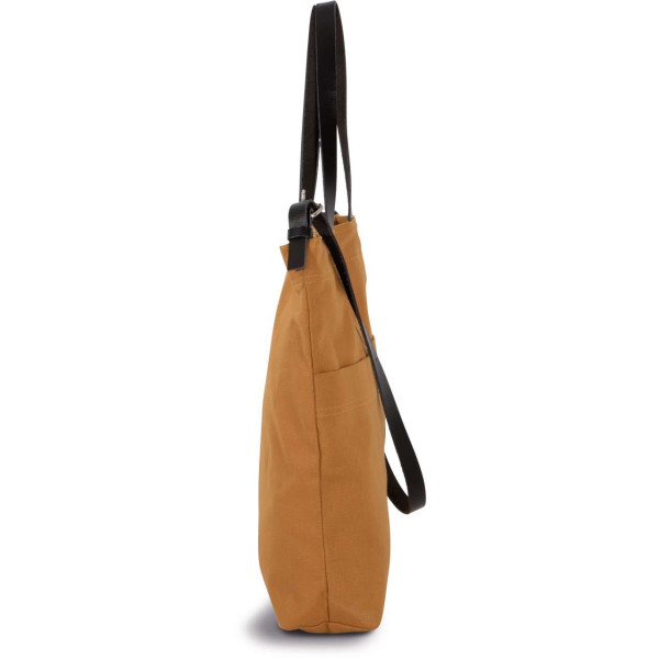 Cotton canvas handbag;Leather handles and shoulder strap;Large front pockets;Inner pocket;Magnetic button fastening;