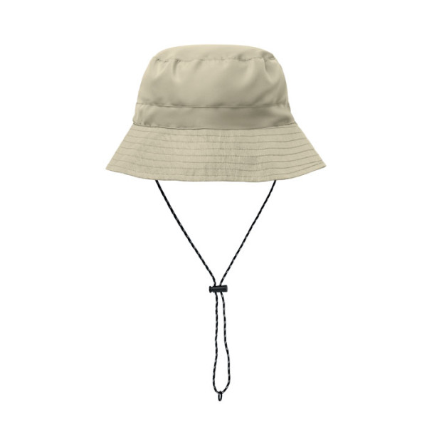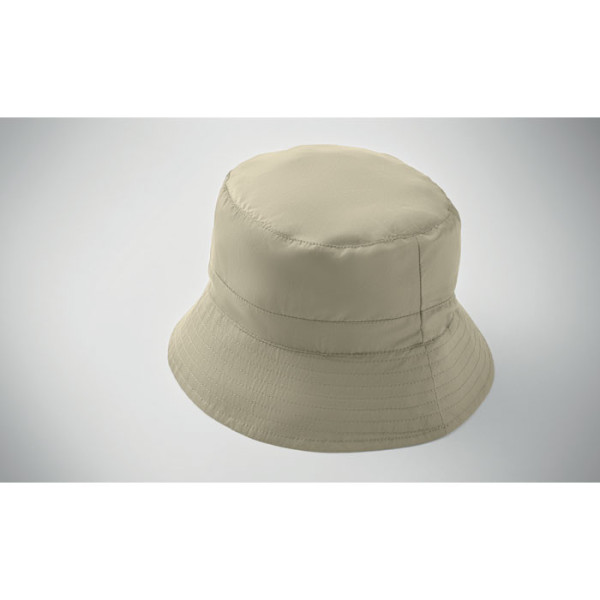Water repellent fisherman hat made of polyester, includes self material pouch with ABS carabiner. 64 gr/m².