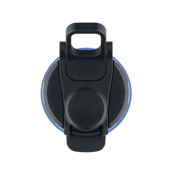 Foldable silicone sports bottle with PP lid, handle, polyester strap, and transparent buckle to secure when folded. Leak-free. Capacity: 500 ml.