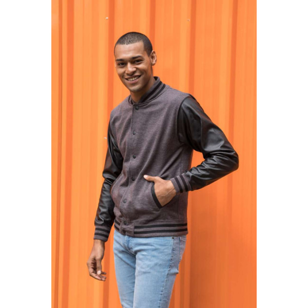 70% Cotton/30% Polyester;100% Polyurethane sleeves;Knitted collar. cuffs.and waistband with stripe detail;Black faux leather sleeves;Press-stud closure;Welt pockets with faux leather trim;Hanging loop at back neck;Taped back neck;Brushed inner fleece;Contrast studs;Simple tear-out label makes it perfect for rebranding;Soft cotton faced fabric creates ideal printing surface;Worldwide Responsible Accredited Production (WRAP) certified production;