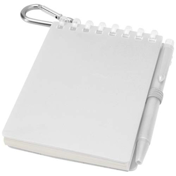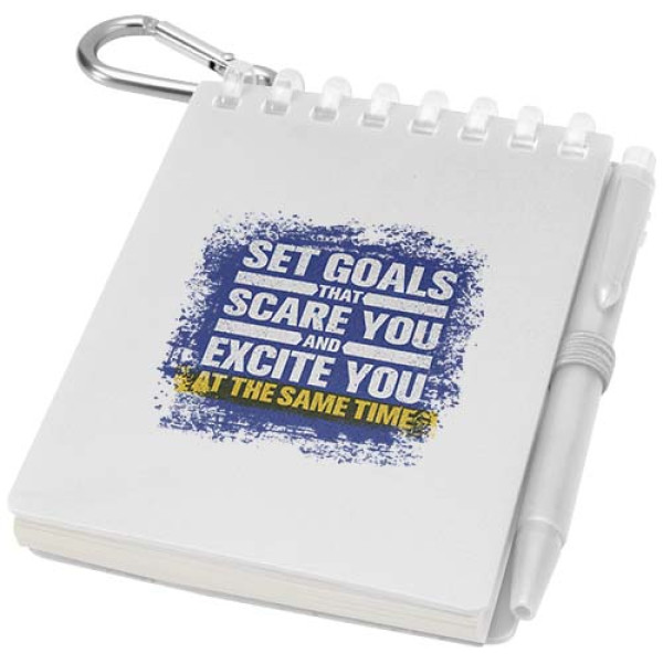 The Lig Mini notebook and pen set is a compact and practical companion for on-the-go note-taking. The spiral-bound notebook has a soft recycled plastic cover and 70 blank sheets of 120 g/m² water-resistant stone paper, making it ideal for outdoor use. With rounded corners and a built-in pen loop, it embraces the mini-size trend while remaining functional. The matching ballpoint pen is made from recycled ABS plastic, writes in black ink, and offers a writing length of 250 metres. A colour-coordinated metal ring allows the set to be easily attached to a backpack, purse, or keychain, making it perfect for durable and portable note-taking. Notebook size: 11 × 7.5 cm.