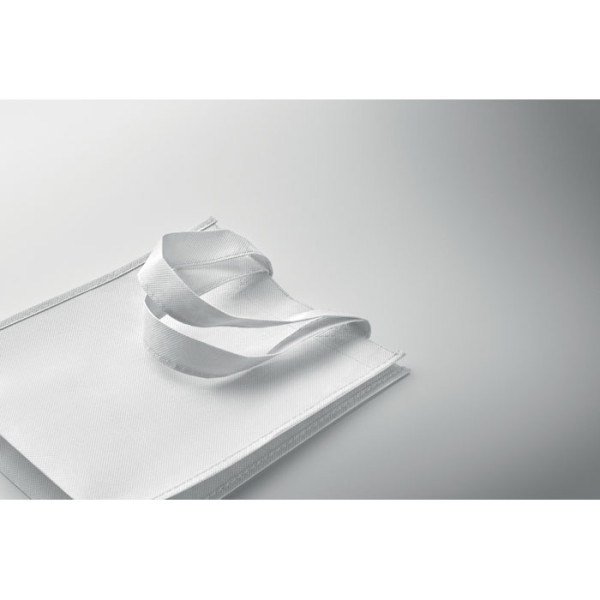 Small gift or goodie bag in RPET non-woven with short handles and gussets. 80 gr/m².