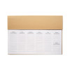 125 page weekly desk planner in 6 languages (EN/DE/FR/ES/IT/NL/PL) with kraft paper cover, carton barrel blue ink push button pen, wooden ruler and sticky note memo pad.