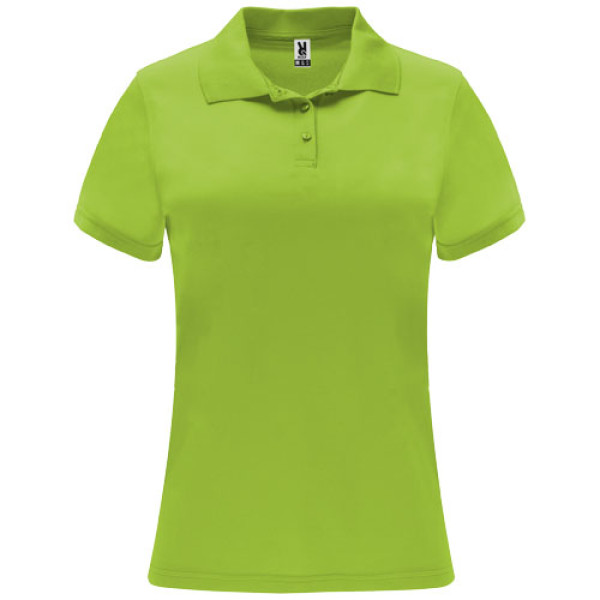 Short-sleeve technical polo shirt for women. Knit collar with three-button placket. Fitted cut. Breathable, easy wash and dry fabric. Removable label. Technical fabric. Breathable fabric. The model is 173 cm and is wearing size S.