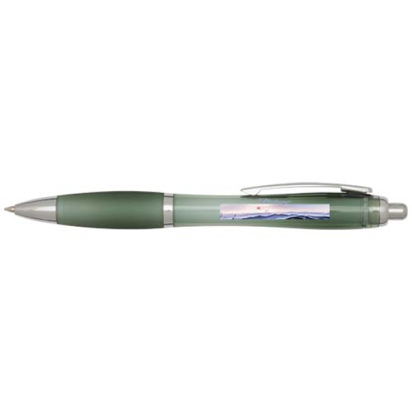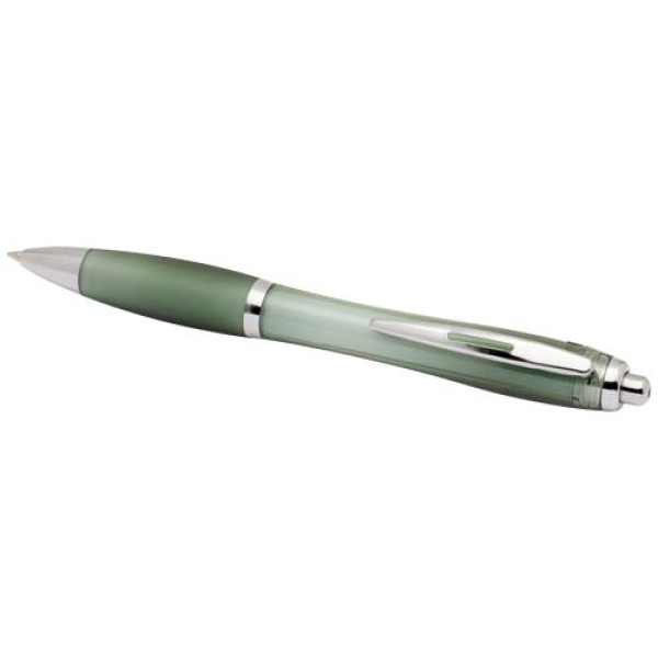 The Nash recycled plastic click-action ballpoint pen features a stylish curvy design with a transparent coloured barrel with silver trims and a matching colour soft grip for comfortable writing. Made from RCS certified recycled ABS plastic, it helps reduce the use of virgin materials while maintaining durability. A rABS logo is featured on the back, highlighting its recycled content. Ink colour: Blue. Nib size: 1.0 mm. Writing length: 1000 metres.