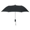 21 inch 2 fold auto open umbrella in 190T pongee with zincify plating steel shaft, ribs and tips. Panels with reflective trim. Black plastic handle with wrist strap. Includes matching pouch with reflective trims. Manual closure.