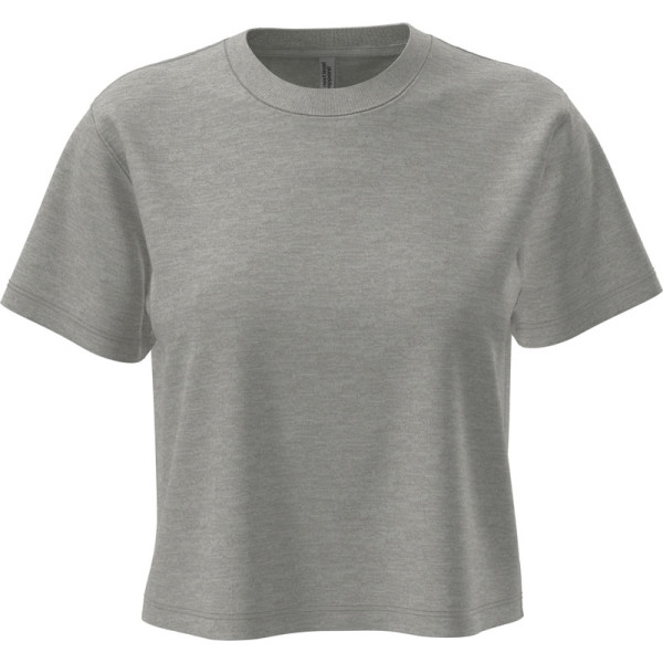 Short cut, oversize fit, rib knit crew neck, shoulder-to-shoulder necktape, TearAway label, 30° washable, gentle wash, suitable for tumble drying. 230g/m², 100% combed ringspun cotton, single jersey, heather grey: 90% combed ringspun cotton, 10% polyester