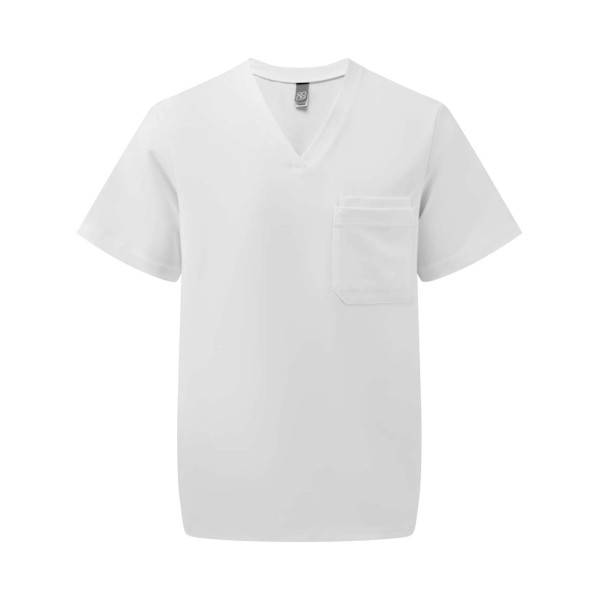 • V-neck style with left chest pocket