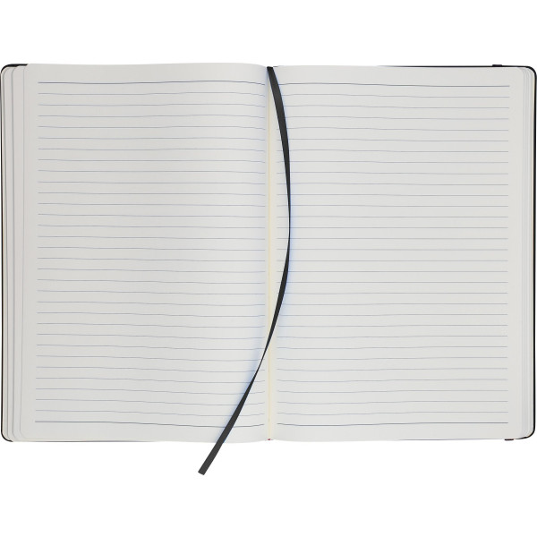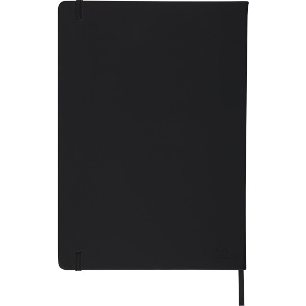 A4 notebook with hard cover made from brightly colored recycled materials (PU). Includes 96 double-sided lined pages (65 gsm) with 0.7 cm line spacing, starting and ending with two blank pages. The paper in this notebook is FSC® Mix certified. Features a matching color elastic band for closure, integrated ribbon marker, and embossed recycled PU logo on the back cover.