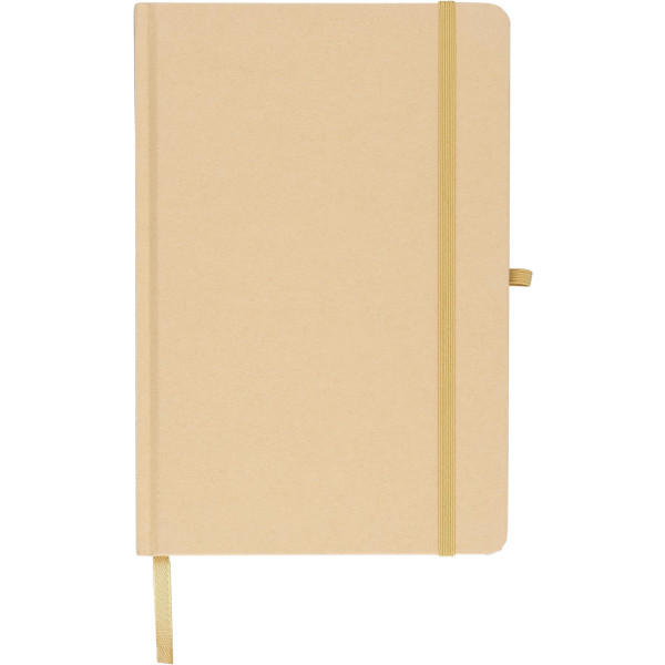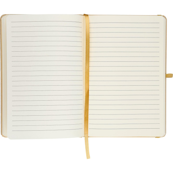 A5 notebook with kraft hard cover and aluminum film backing, designed for laser engraving with a mirror effect that appears after engraving. Contains 80 lined pages of 70 gsm paper for smooth writing. The paper in this notebook is FSC® Mix certified. Finished with matching color details including an elastic band, ribbon marker, and pen loop.