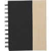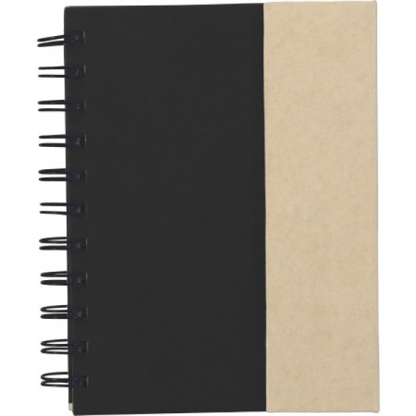 Cardboard, wire bound notebook with 60 lined pages, a magnetic closure, ballpen with black ink, 7,5 x 5cm sticky note pad, and 4 colours of small sticky notes, 25 sheet per colour.