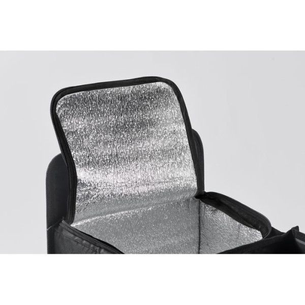 Foldable car organizer in 600D RPET polyester with 3 compartments of which one cooler compartment.