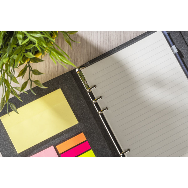 The NOTI organizer contains 60 lined sheets that can be replaced. Thanks to this, the product will serve for a long time. Inside, there are colorful sticky notes, as well as a transparent pocket closed with a zipper for storing office supplies, business cards or, for example, a protective mask. The cover is closed with a magnet, made of paper.