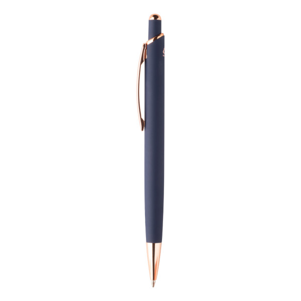Recycled aluminium ballpoint pen with rubberized finish and rose gold details. With special coating for mirror laser engraving in rose gold colour. With blue refill.