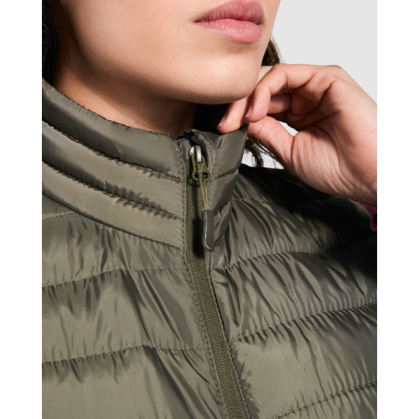 Waterproof padded vest. Tone-inverted front zip with chin guard of the same fabric. Side pockets with tone-inverted zips set into shaped side panels for a more tailored chest fit. Tone-inverted elastic piping in armholes and hem. Solid or contrasting colour lining options.