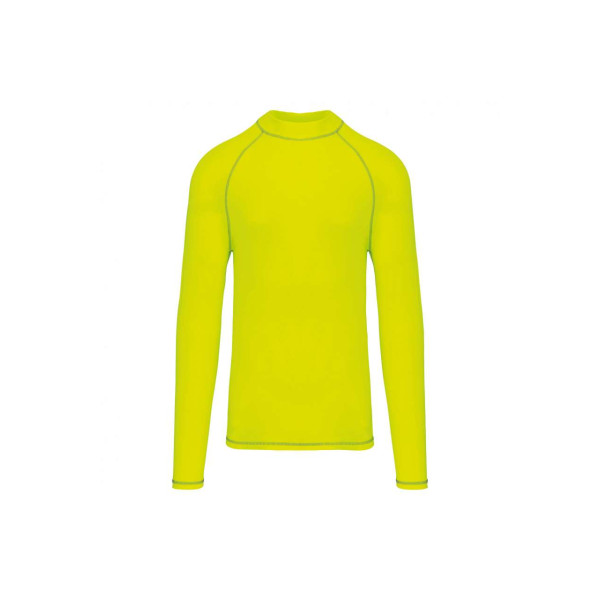 Made from 88% recycled polyester and 12% elastane;Stretch mesh;Skinny fit;UV50+ protection meeting standard EN13758-1&2;Long raglan sleeves with contrasting topstitching;High neck;Elastic buckle inside front hem to insert the shorts' drawstring and hold the t-shirt;Twin-needle stitch on sleeves and bottom hem;Tear-off brand label for ease of rebranding;
