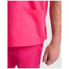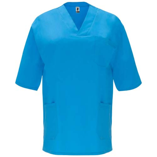 Unisex service top with short-sleeves. Crossed peak neckline. Pocket on chest and two side pockets. Side slits on hem.