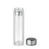 Double wall borosilicate glass bottle. It has an LED touch thermometer incorporated in to the top of the lid and tea infuser inside. 1 replaceable CR 2450 battery included. Leakproof. Capacity: 390 ml. Leak free.