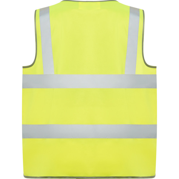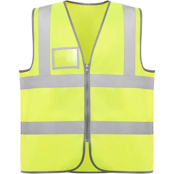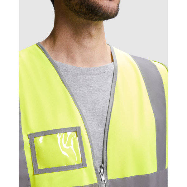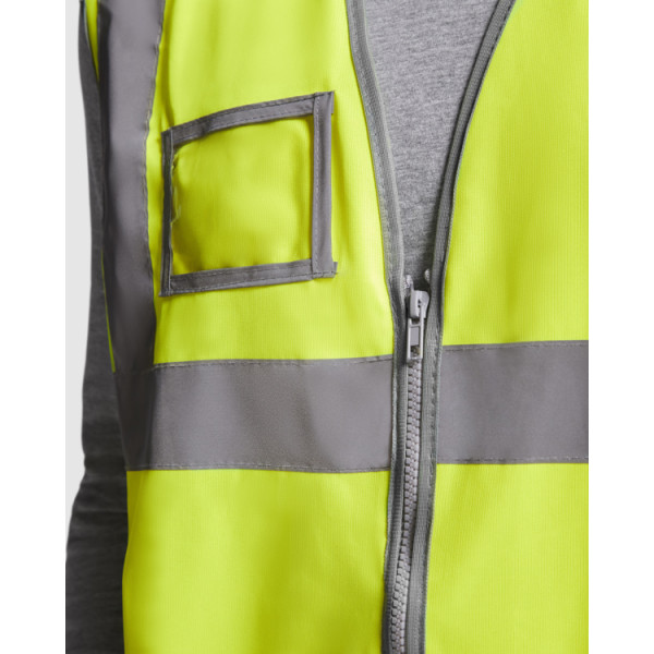 High-visibility vest.·Two reflective stripes on the body and two on the shoulder.·No side seams.·Identification card holder pocket.·Front zip closure.·Colour options available.·Outer Roly WRK label.·Wash cycles: x25