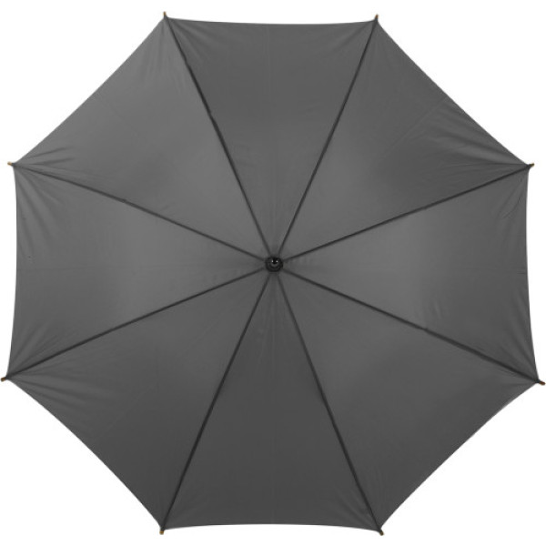 Polyester (190T) automatic umbrella with eight panels. Metal frame and wooden shaft and handle.