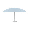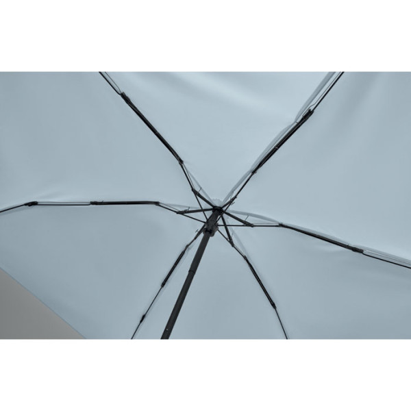19-inch 5-fold manual umbrella made of 190T pongee with matching pouch. It has a metal and fibreglass windproof frame, black rubberized handle with wrist strap, and compact 17 cm folded size.