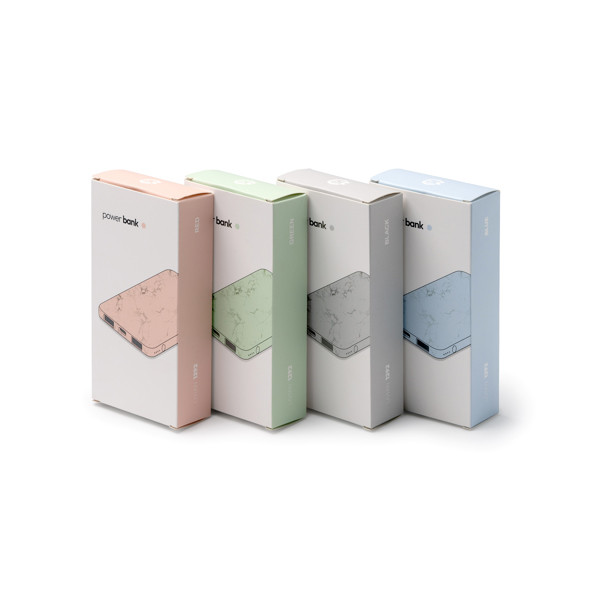 Power bank made from recycled bottle caps. 5.000 mAh capacity. Type C input. USB and Type C outputs. Presentation in eco design box.
