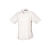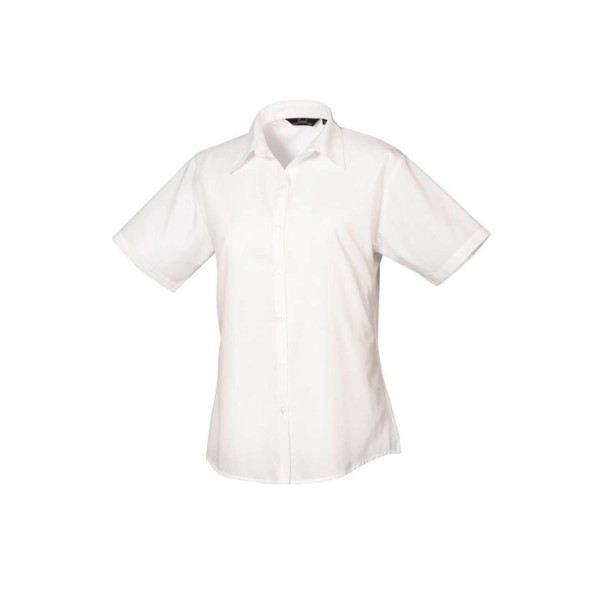 Fabric;65% Polyester. 35% Cotton Poplin;Colour: 105gsm;White: 115gsm;Features;Soft collar styling;Rounded bottom hem;Bust darts & back darts;Easy care fabric;Short sleeves;Pearlized buttons on Light Blue & White blouses;Self-colour buttons on rest;Tailored fit;Easy care;