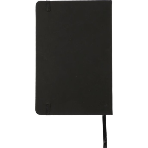 PU notebook (approx. A5) with 96 pages of 5 mm grid squares without a frame. Includes a ribbon marker and an elastic band over the cover.