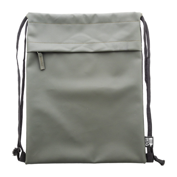 RPET drawstring bag with PU coated front side and zipped front pocket. PU coated 600D RPET polyester with distinctive RPET label.