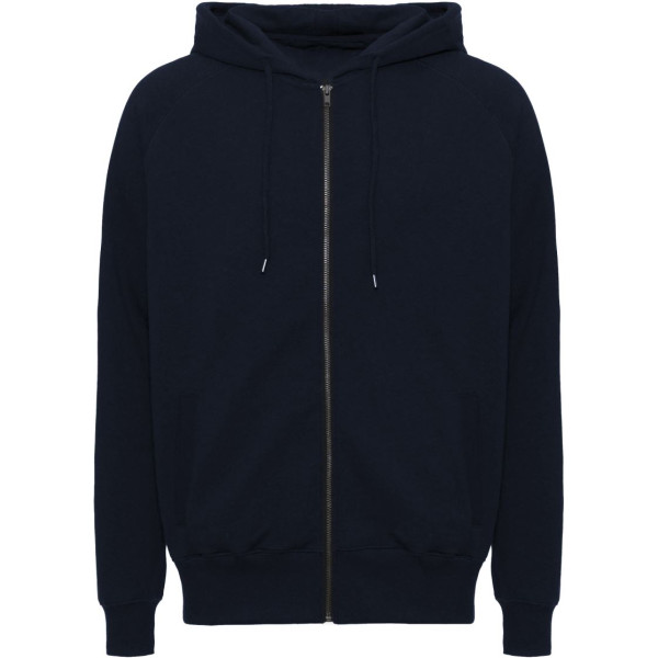 Straight cut, hood with cord, raglan sleeves, ribbed cuffs on sleeves and hem, kangaroo pockets, durable fabric, 2-thread sweat quality, soft touch, brushed inside, by using recycled materials and avoiding re-dyeing, 99% less water is used and CO2 emissions are reduced by 50%, minor color variations may occur in the color white, 40° washable, suitable for tumble drying at low temperature. 280g/m², 100% recycled fibers, 60% recycled cotton, 40% recycled polyester (rPET)