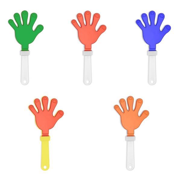 Two-colour clapper in the shape of a hand with handle. Perfect for events and celebrations.