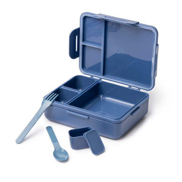 PP lunchbox with three removable, one-piece compartments. Hermetic closure with anti-drip system. Individual additional compartment for condiments. Includes fork and spoon. Capacity: 1.3L.
