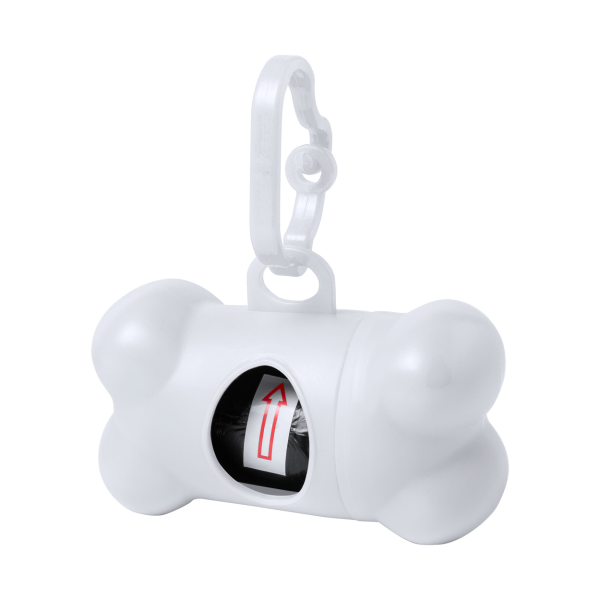Plastic, bone shaped dog waste bag dispenser with carabiner and 15 bags.