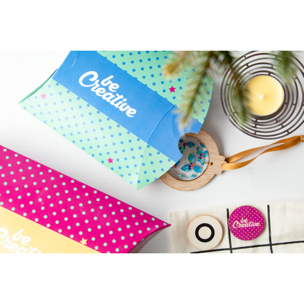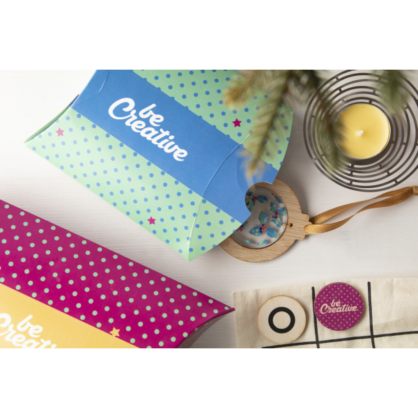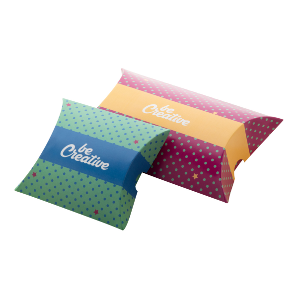 Custom made, full colour printed paperboard pillow box. Delivered flat-packed. MOQ: 50 pcs.