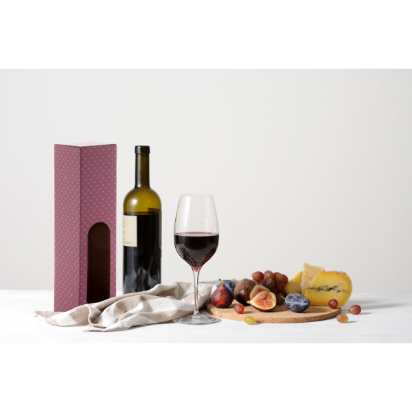 Custom made, full colour printed corrugated cardboard box for one 0,75 l wine bottle. Delivered flat-packed, without wine. MOQ: 50 pcs.