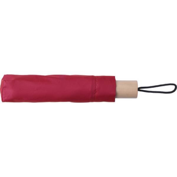 RPET 190T, foldable umbrella with eight panels and oak wood handle. Including pouch.