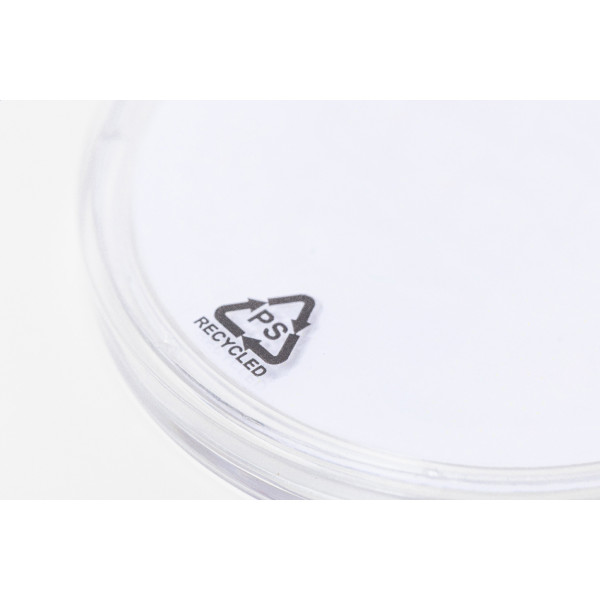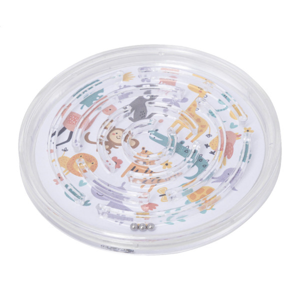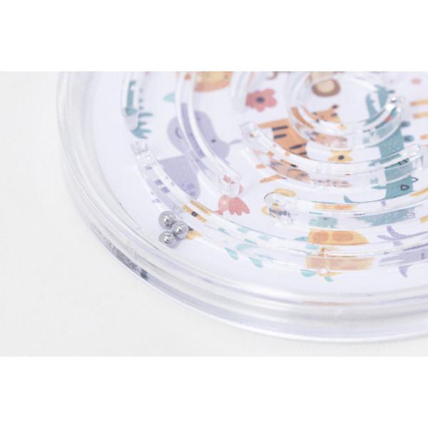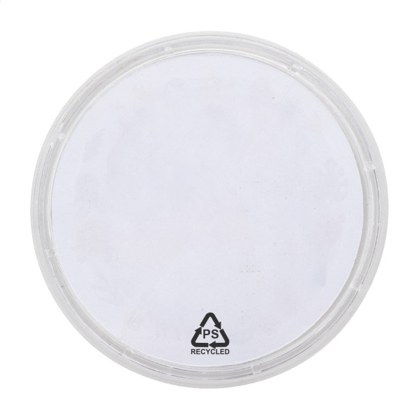 Round shaped, recycled PS labyrinth game with three metal balls. With custom full colour paper insert. Price includes digital printing on both sides. MOQ: 100 pcs.