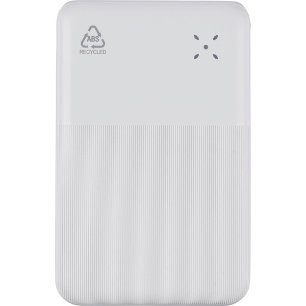 Recycled ABS powerbank with 20,000 mAh Li-ion battery and 22.5W fast charging. Features Type-C input and output, Type-A input, and an LED indicator for battery status. Equipped with protection against overheating, short circuit, overvoltage, and overcurrent. Includes label on the back with Recycled ABS logo. Individually packaged in a brown cardboard box with tissue paper inside.