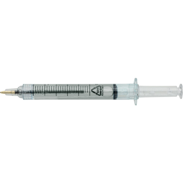 Ballpen designed in the shape of a syringe, filled with colored liquid for a playful and eye-catching look. Made with recycled ABS, reducing plastic waste while maintaining strong impact resistance and long-lasting durability. Equipped with a black writing refill and push mechanism. Includes a stylus tip for use on capacitive touchscreens. Finished with an inmould recycled ABS logo.