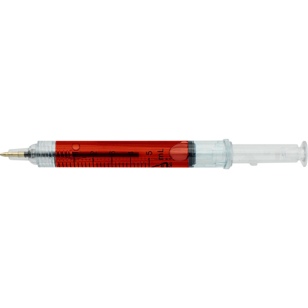 Ballpen designed in the shape of a syringe, filled with colored liquid for a playful and eye-catching look. Made with recycled ABS, reducing plastic waste while maintaining strong impact resistance and long-lasting durability. Equipped with a black writing refill and push mechanism. Includes a stylus tip for use on capacitive touchscreens. Finished with an inmould recycled ABS logo.