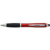 Ballpen featuring a single-color rubber-finish body with silver accents and a black capacitive touchscreen stylus tip. Made with recycled ABS, reducing plastic waste while maintaining strong impact resistance and long-lasting durability. Includes a push mechanism, blue writing ink, and an engraved recycled logo on the barrel.