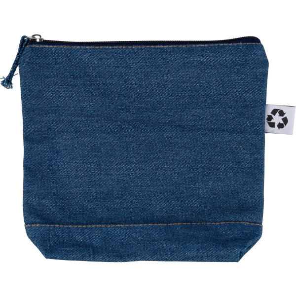 Recycled denim cosmetic bag with size 21 x 18.5 cm. Features a main zippered compartment and a recycled label on the outside.