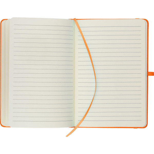 A5 notebook with recycled hard cover, featuring an embossed recycled logo on the back. Made with durable, flexible materials (PU) that provides comfort, cushioning, and long-lasting performance. The cover is suitable for laser engraving, revealing a subtle tone-on-tone color effect. Includes 80 lined pages of 70 gsm paper, with matching color elastic band, ribbon marker, and pen loop. The paper in this notebook is FSC® Mix certified.