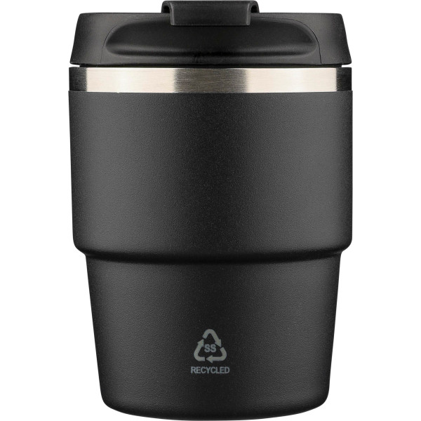 Recycled stainless steel double-walled vacuum mug (175 ml) with an interior of stainless steel 304 and exterior of stainless steel 201. Features a powder coating finish and a PP screw lid. Compact size fits under most coffee machines. Includes a laser-engraved recycled logo on the front. Individually packaged in a brown cardboard box.