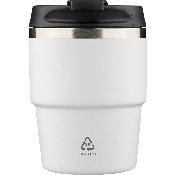 Recycled stainless steel double-walled vacuum mug (175 ml) with an interior of stainless steel 304 and exterior of stainless steel 201. Features a powder coating finish and a PP screw lid. Compact size fits under most coffee machines. Includes a laser-engraved recycled logo on the front. Individually packaged in a brown cardboard box.
