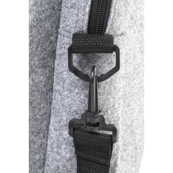 RPET felt document bag with zipped main compartment and front pocket. With laptop (15") compartment, trolley strap and adjustable shoulder strap. With distinctive RPET label.