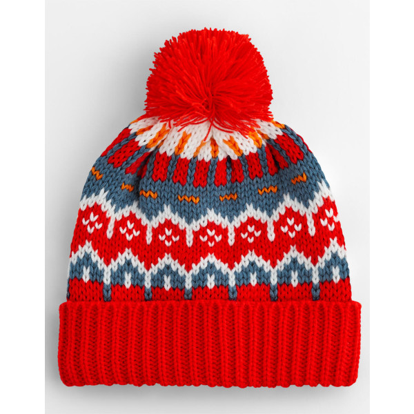 ·56% Polyester, recyled, 44% Acrylic ·Full fleece recycled polyester lining ·Timeless Fair Isle pattern ·Classic styling ·Self-coloured pom pom ·Cuffed design for optimal decoration ·TearAway label for ease of rebranding