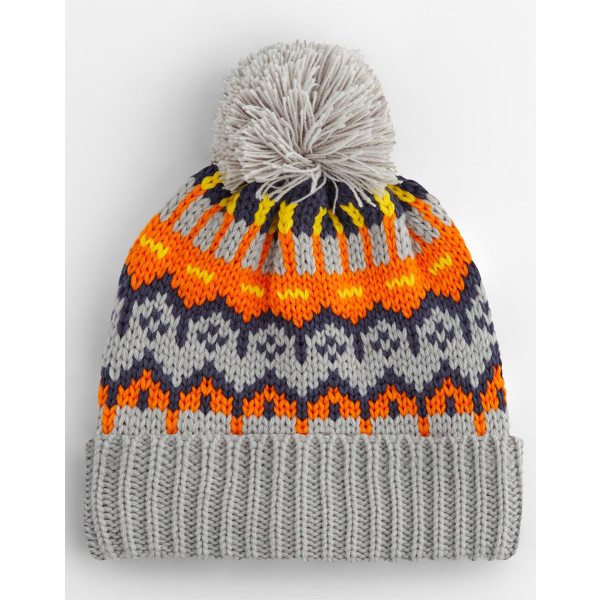 ·56% Polyester, recyled, 44% Acrylic ·Full fleece recycled polyester lining ·Timeless Fair Isle pattern ·Classic styling ·Self-coloured pom pom ·Cuffed design for optimal decoration ·TearAway label for ease of rebranding