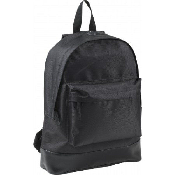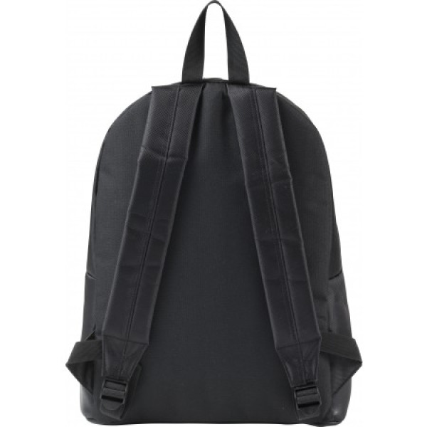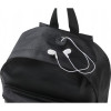 Polyester (1680D) backpack with leather accents, padded back and shoulder straps and an opening for headphones.